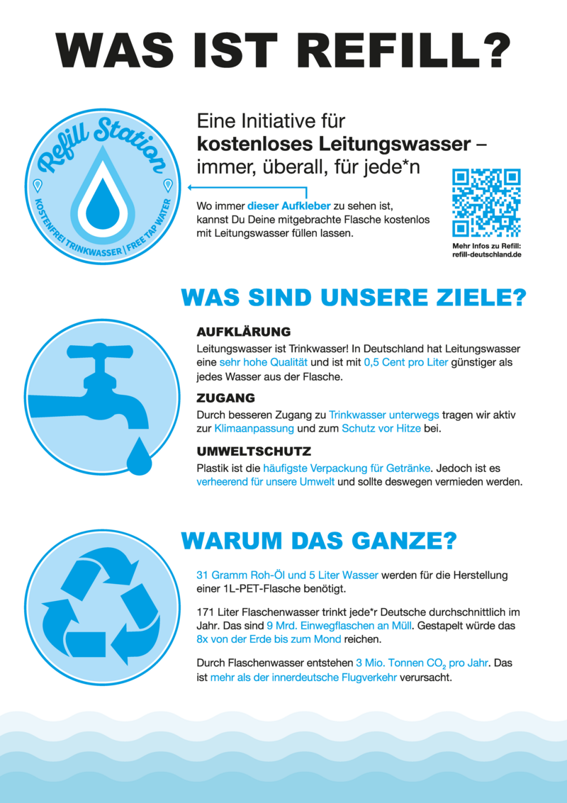 Die Refill-Initiative ist ein wichtiger Schritt in Richtung Nachhaltigkeit und Umweltschutz. Lass uns gemeinsam Plastikmüll reduzieren und eine umweltfreundlichere Stadt schaffen. Halte Ausschau nach den blauen Refill-Aufklebern und fülle Deine Wasserflasche kostenlos auf!